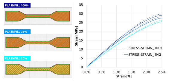 Tensile test and a bending tests were performed on the 3D-printed specimens to see how varying infill grades affected the response to the tests. The tensile test resulted in datasets for the yield point and the stress function. A numerical–experimental validation was performed for both the tensile and bending tests. The average experimental stress–strain curves for different infill grades began in close agreement and then separated slightly as the strain level increased.